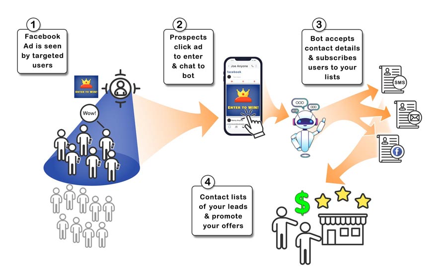 Advertising on Facebook attracts prospective clients & your automated assistant convinces them to subscribe to your business and buy from you.